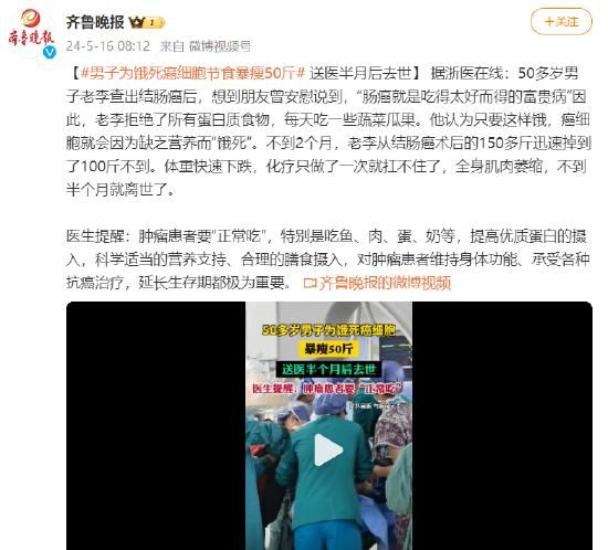 [#男子为饿死癌细胞节食暴瘦50斤# 送医半月后去世] 据浙医在线:50多岁男子老李查出结肠癌后,想到朋友曾安慰说到,“肠癌就是吃得太好而得的富贵病”因此,老李拒绝了所有蛋白质食物,每天吃一些蔬菜瓜果。他认为只要这样饿,癌细胞就会因为缺乏营养而“饿死”。不到2个月,老李从结肠癌术后的150多斤迅速掉到了100斤不到。体重快速下跌,化疗只做了一次就扛不住了,全身肌肉萎缩,不到半个月就离世了。