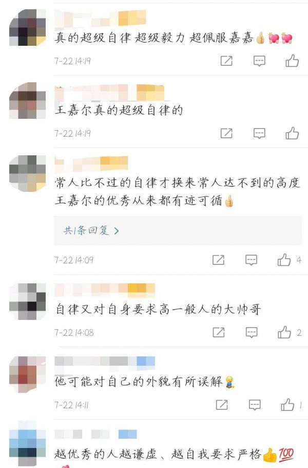 看到王嘉尔的减肥方法之后,网友纷纷表示这真的不是常人能坚持下去的,留言道:"常人比不过的自律才换来常人达不到的高度,王嘉尔的优秀从来都有迹可循"、"越优秀的人越谦虚、越自我要求严格"等等。