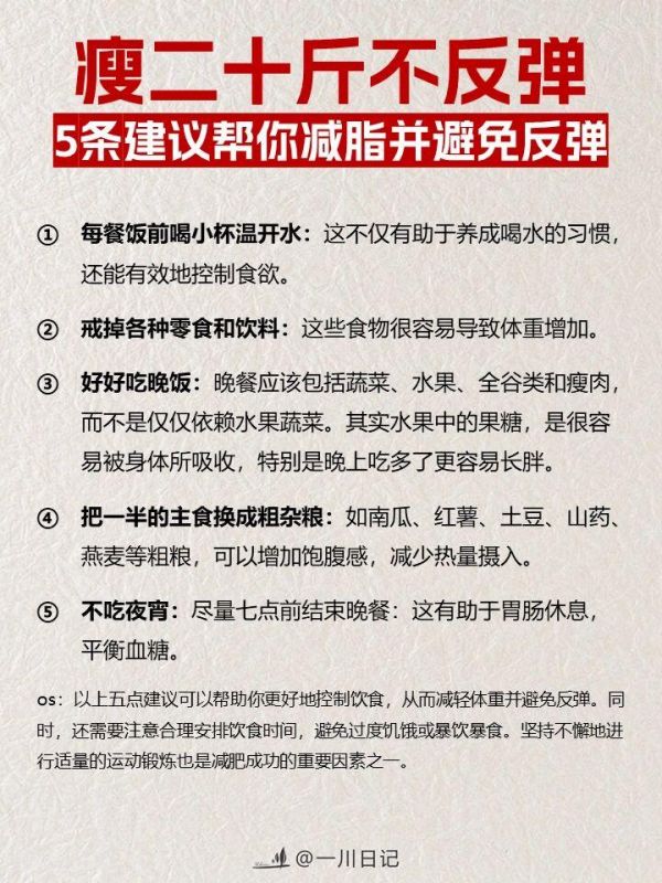 os:以上五点建议可以帮助你更好地控制饮食,从而减轻体重并避免反弹。同时,还需要注意合理安排饮食时间,避免过度饥饿或暴饮暴食。坚持不懈地进行适量的运动般炼也是成功的重要因素之一。